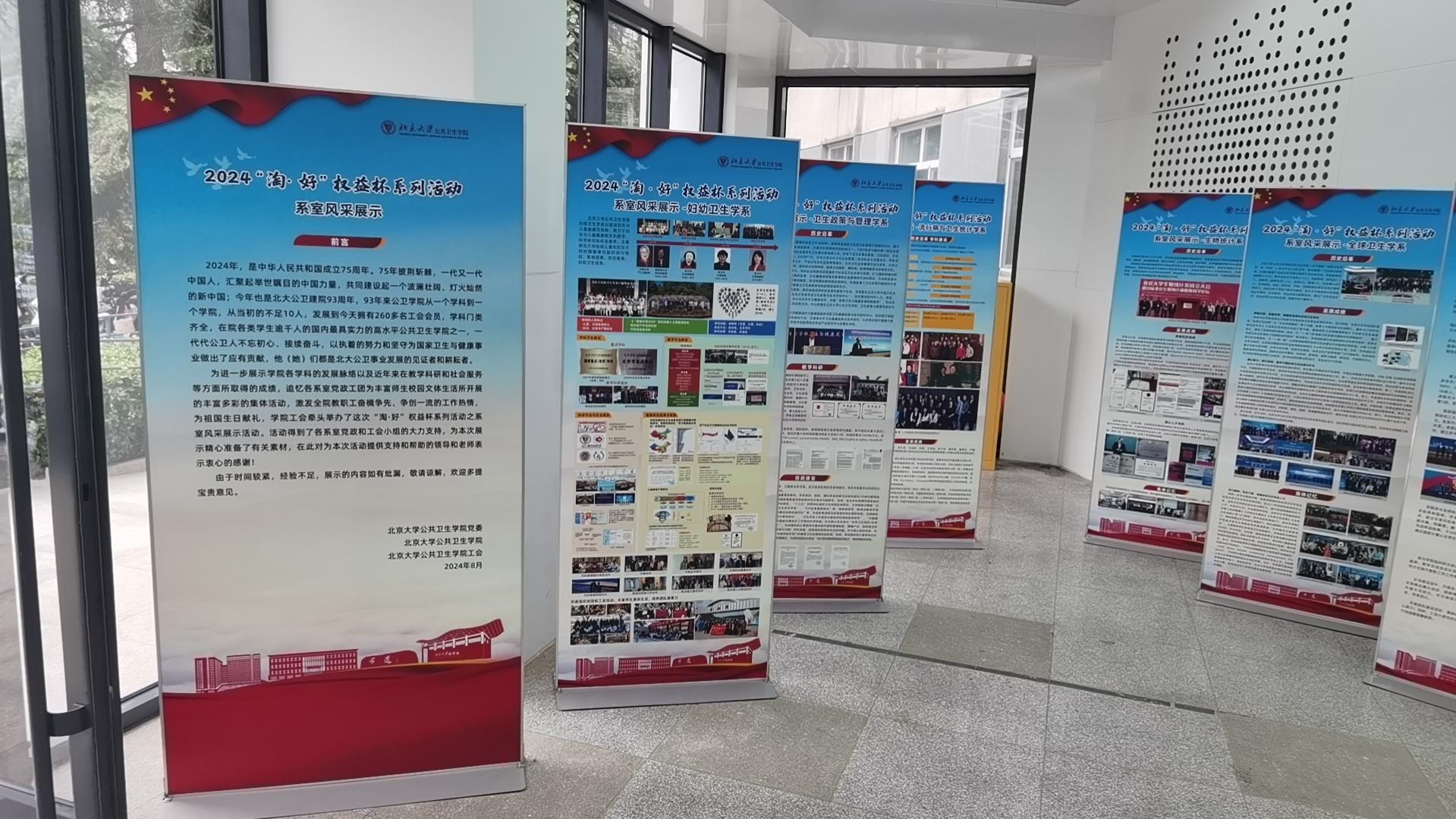 16张立屏展示,设立在公卫学院正门大厅,便于教职工观展,展示将伴随教师节、国庆节,迎来北大医学办学112周年。活动通过对系室历史沿革、发展成绩的梳理总结,通过对丰富多彩的校园生活和实践活动的展示,实证北大公卫发展点滴成果,将更好激发全体教职工奋楫争先、争创一流的劳动热情,为祖国75岁生日献礼!