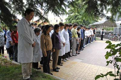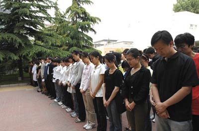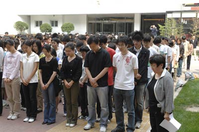 5月18日周日下午,收看到国务院关于悼念汶川地震中遇难同胞的公告,学院在第一时间通知了各系主任、教育办公室、各系秘书等相关人员。当晚,就有一些老师回信,表示一定参加默哀等活动。在内蒙现场调查的林晓明教授回信表示她虽然无法赶回学校,也会通知自己的学生参加;在美国的吴涛老师也写来邮件,表示要在当地参加悼念活动。