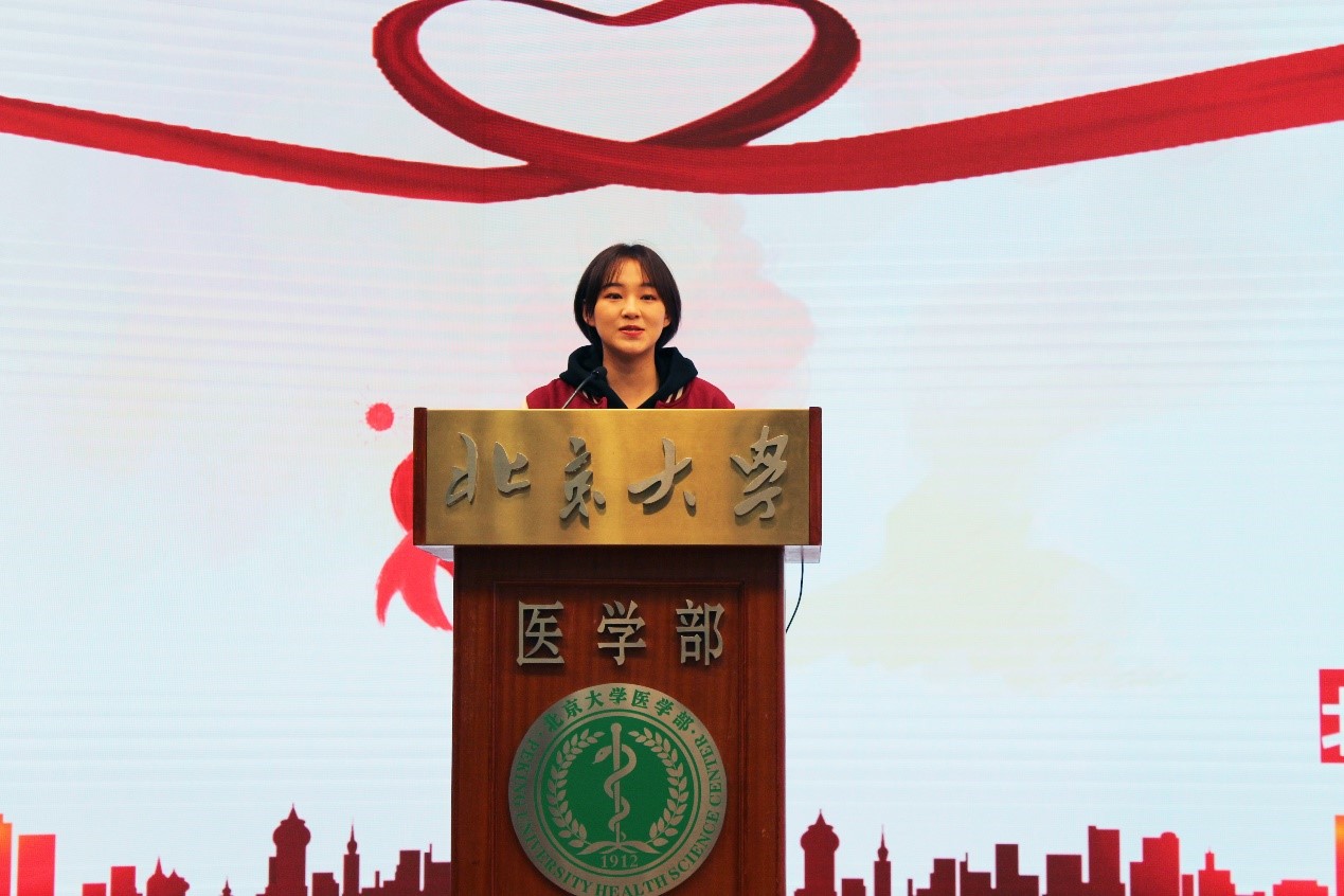 北京大学公共卫生学院学生会主席王雨竹同学,代表全体公卫学子在启动仪式上进行发言。她提到预防艾滋病宣传周是北大公卫学院的品牌活动,在祖国日新月异的今天,作为一名北大公卫人生逢其时、重任在肩,新时代的北大公卫青年学子一定不负使命,在防艾的道路上继续前行。