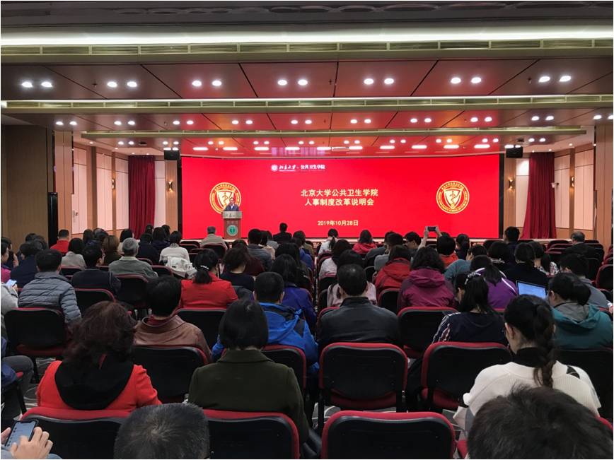 2019年10月28日下午,北京大学公共卫生学院人事综合改革说明会在逸夫楼209报告厅召开。公共卫生学院党政领导班子出席会议,全院教职工140余人参加会议。会议由党委郝卫东书记主持。
