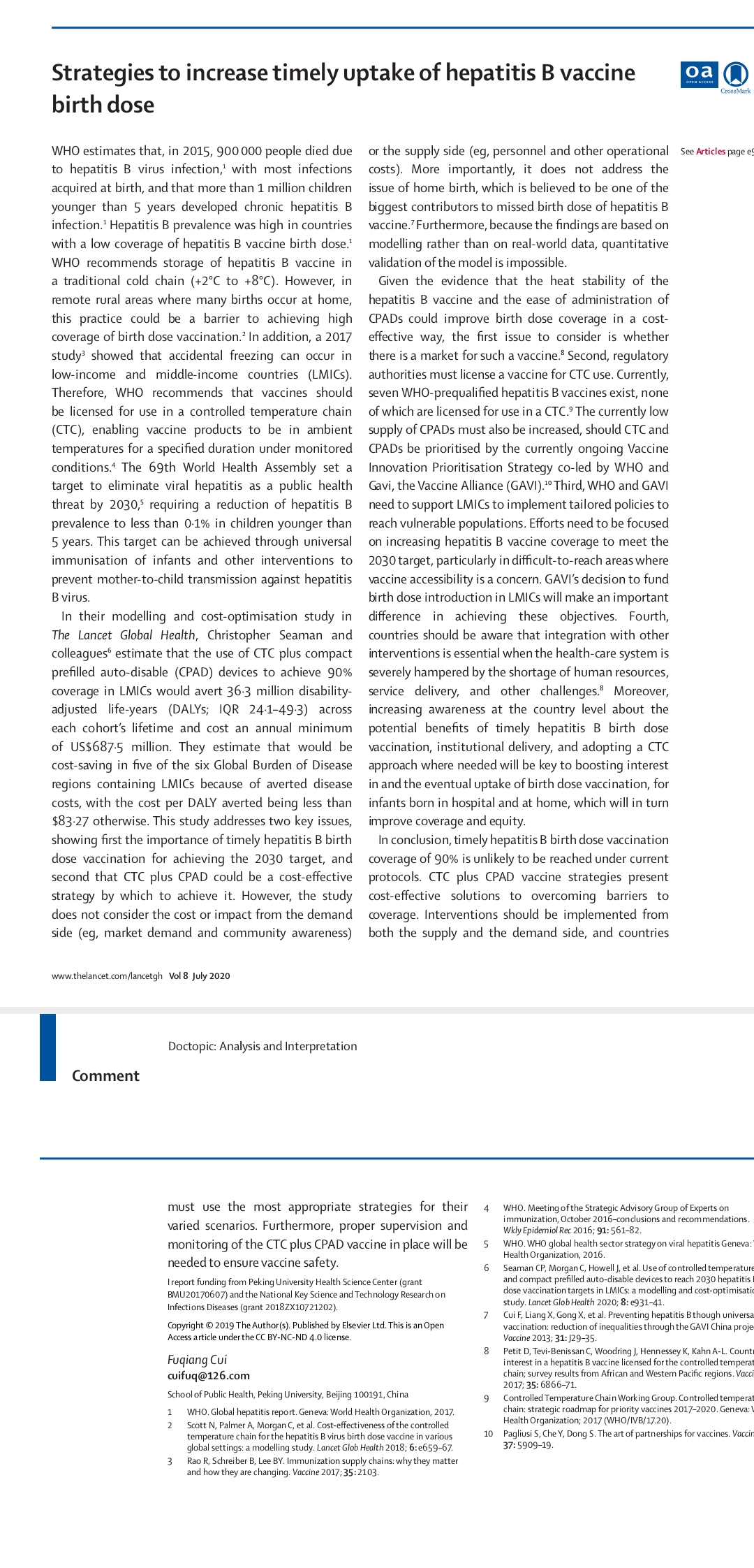 公共卫生学院崔富强研究员受Lancet Global Health邀请,撰写的提高乙肝疫苗首针及时接种策略的评论今日在线发表。世界卫生组织制定了2030年消除病毒性肝炎作为公共卫生威胁的目标,其中一项评价指标就是乙肝疫苗首针及时接种率。因多种原因,在发展中国家,尤其是住院分娩率低的地方,首针及时接种面临很大挑战。本评论旨在呼吁不能普及住院分娩的发展中国家提高对乙肝疫苗首针及时接种的认识,从提高住院分娩率、促进市场需求、激励药品注册和加强资源整合等方面开展协作,引进经济有效的创新技术,实现新生儿乙肝疫苗首针及时接种,保护全球每年近100万儿童免受乙肝病毒感染,为实现2030年全球肝炎控制目标共同努力。