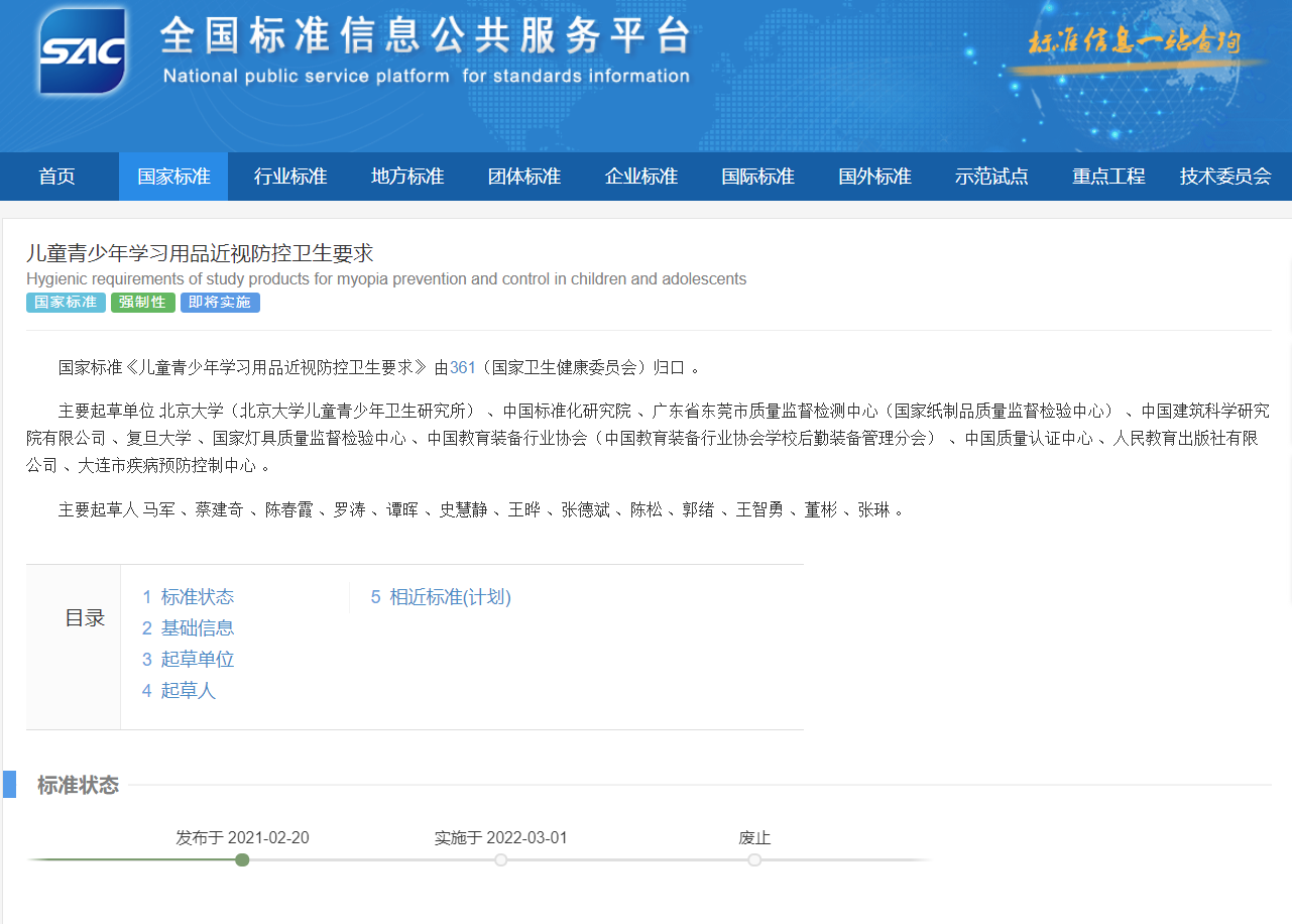 国家市场监督管理总局和国家标准化管理委员会于2021年2月20日发布了强制性国家标准GB 40070—2021《儿童青少年学习用品近视防控卫生要求》,该标准将于2022年3月1日正式实施。