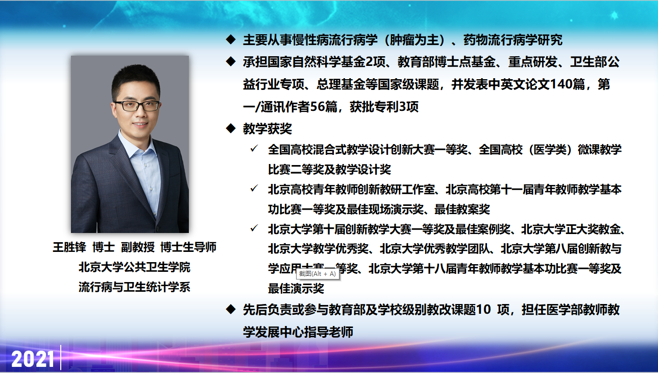 2021年12月28日,公卫学院双语教学兴趣小组邀请流行病与卫生统计系王胜锋老师分享案例教学和混合教学的经验和体会。公共卫生学院50余位老师和同学参加本次讲座。学院党委副书记、工会主席詹思延出席,兴趣小组组长吴涛老师主持讲座。