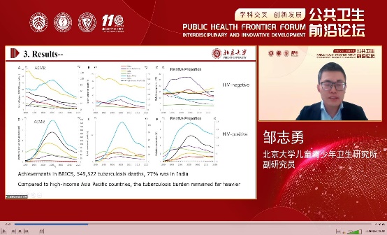 下午青年论坛专场于13:30分准时开始。专场第一部分由儿童青少年卫生研究所董彬研究员主持,三位青年学者围绕传染病、以及环境暴露对健康的影响两方面进行了报告。北京大学李晶副研究员做了“大气PM2.5化学组分对易感人群健康影响”的报告。她基于中国和美国的横断面研究和队列研究,介绍了大气PM2.5化学组分,如黑炭、硫酸盐、硝酸盐、土壤颗粒物等,对儿童高血压、老年痴呆的影响。研究结果为下一步精确评估空气污染对人群健康的影响,确定PM2.5组分指导值提供了数据支持。北京大学董彦会副研究员报告了“儿童邻苯二甲酸酯暴露对健康的影响-基于队列人群的证据”。他基于厦门市儿童发育队列,重点介绍了邻苯二甲酸酯暴露对儿童肥胖、高血压、血脂异常等心血管代谢异常的影响,强调了生活方式和激素水平差异对邻苯二甲酸酯健康危害的作用,相关结果为今后系统评估儿童邻苯二甲酸酯暴露风险及健康危害,以及相关限量和科学管理提供了重要依据。北京大学邹志勇副研究员做了“金砖国家HIV-阴性和HIV-阳性人群结核病疾病负担研究”的报告。他使用1990年—2019年GBD数据,使用年龄-时期队列分析方法,介绍了金砖五国结核病死亡率的变化情况和疾病负担趋势,尤其介绍了HIV感染对于结核病死亡率的重要影响,这点在年轻人群中尤其需要关注。在点评环节,哈尔滨医科大学武丽杰教授和华中科技大学余毅震教授从报告内容、研究意义、发展方向等方面给出了具体建议,使青年研究者对相关领域未来的课题开展有了更深的认识。专场第二部分由妇幼卫生学系副主任周虹副教授主持。三位青年学者围绕儿童健康及其早期危险因素这一主题进行了报告。浙江大学宋培歌研究员的报告为“全球儿童疾病负担研究-以维生素A缺乏为例”。她首先从疾病负担的定义入手,介绍了疾病负担的研究方法,再以儿童维生素A缺乏为例介绍了全球儿童维生素A缺乏的疾病负担,为未来的疾病负担相关研究带来了启示。美国贝勒医学院雷云平助理教授报告了“Genetic Study of Neural Tube Defects”,他从基因突变、信号传导、体细胞突变等角度重点阐述了神经管畸形的遗传学研究进展,对未来的相关机制研究提供了重要的参考。北京大学计岳龙副研究员报告了“神经心理发育的生命早期风险因素的探索”,从孕期营养、孕期代谢、环境暴露几个方面较为全面地介绍了可能影响儿童神经心理发育的早期风险因素,对未来的相关机制研究和干预研究给出了诸多启示。在点评环节,安徽医科大学陶芳标教授和北京大学任爱国教授首先对三位年轻学者的报告内容及研究意义进行了肯定,并对儿少卫生与妇幼保健学未来的学科发展提出了殷切希望,特别指出未来需要创造更多的机会加强学科交流,以进一步推动整个学科的发展。专场第三部分由生育研究所副所长王琳琳研究员主持。三位青年学者聚焦于环境污染与妇儿生育健康领域。北京大学薛涛研究员报告了“中国大气污染治理的健康效益”。为了准确评估我国PM2.5暴露,团队开发了一套集合卫星遥感、地面观测和大气化学传输模式的算法;基于环境大数据的机器学习,证明了PM2.5和臭氧浓度在我国北方地区呈现负相关特征;还全面评估了我国PM2.5和臭氧长短期暴露的健康风险。北京大学李钦副研究员报告了“大气污染对女性生殖功能的影响”。他介绍了大气颗粒物污染的不良效应在不同人群中存在差别,对于孕妇和儿童,由于其特殊的生理状态,需要针对性评估其健康风险。研究聚焦了孕妇、胎儿、儿童三个人群的健康风险,并在这个领域取得了丰硕的学术成果。英国雷斯特大学蔡裕通助理教授报告了“Air quality and children health: the UK perspectives”。团队基于英国的研究,关注了空气质量与儿童健康问题,结合了人群队列、临床数据以及实验室研究,探讨了环境因素的健康危害,取得了一系列的高水平学术成果。在点评环节,上海交通大学张军教授高屋建瓴、析精剖微地给与了专业指导。针对青年学者们涉及的流行病学研究,提出不要局限于数据统计分析,要能结合基础研究进一步验证解释数据分析中发现的现象,使我们青年学者们会受益匪浅。中国疾病预防控制中心李湉湉教授不仅给予青年学者们非常专业的点评,还给与了具体细致的指导,同时指出这一领域目前存在的重点需要关注的问题,帮助青年学者们把握选题方向,对青年学者们提出殷切的期望。分论坛于17:30圆满结束,共有2.49万名专家、学者在线上观看了直播。