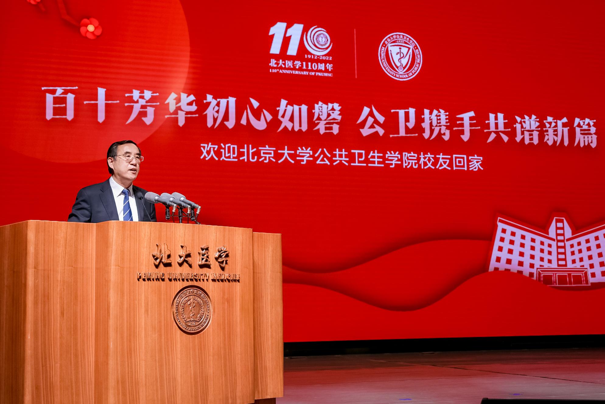 北京大学医学部党委常务副书记、北医校友会副会长徐善东致辞。他向所有返校校友表示热烈欢迎,并转达了柯杨教授的诚挚的问候;与校友一起分享了自己自求学至今对公共卫生的感悟,他说:公共卫生(的需要)在哪里,北大公卫人就在哪里。事业、格局、情怀、责任在北大公卫人身上融为一体;向当前正奋战在各地卫生健康委和疾控中心的公卫师生和校友表示深深的敬意,并祝愿所有北大公卫人事业顺利、家庭美满。