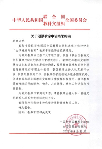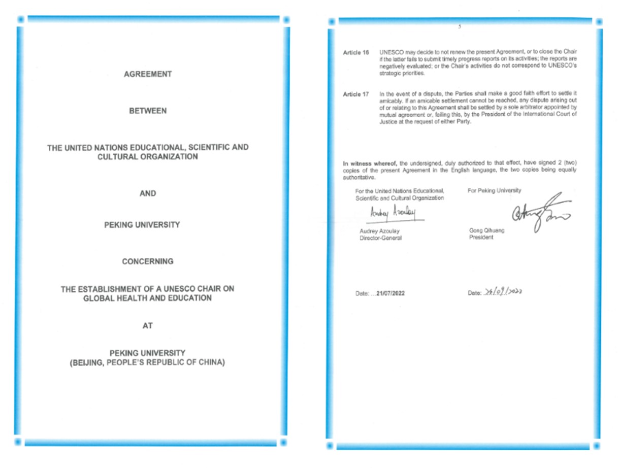 (图1 北京大学-联合国教科文组织“全球健康与教育”教席协议)