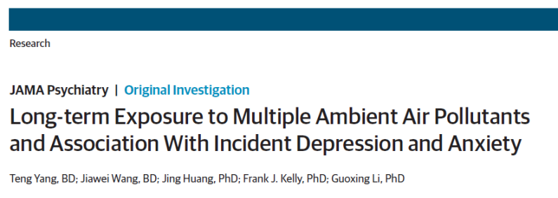 2023年2月1日,北京大学公共卫生学院黄婧和李国星团队(健康城市研究团队)在精神病学领域顶刊JAMA Psychiatry (IF2022=25.911)在线发表了题为“Long-term Exposure to Multiple Ambient Air Pollutants and Association With Incident Depression and Anxiety”的研究论文。该研究探讨了大气污染长期暴露对抑郁和焦虑发病风险的影响。目前研究已被全球115家新闻媒体报道,包括CNN、National Geographic、Medical Press、Neurology Advisor、ScienceMag、EurekAlert等,文章的受关注指数位于所有统计关注度论文的前5%(Altmetric指数938)。