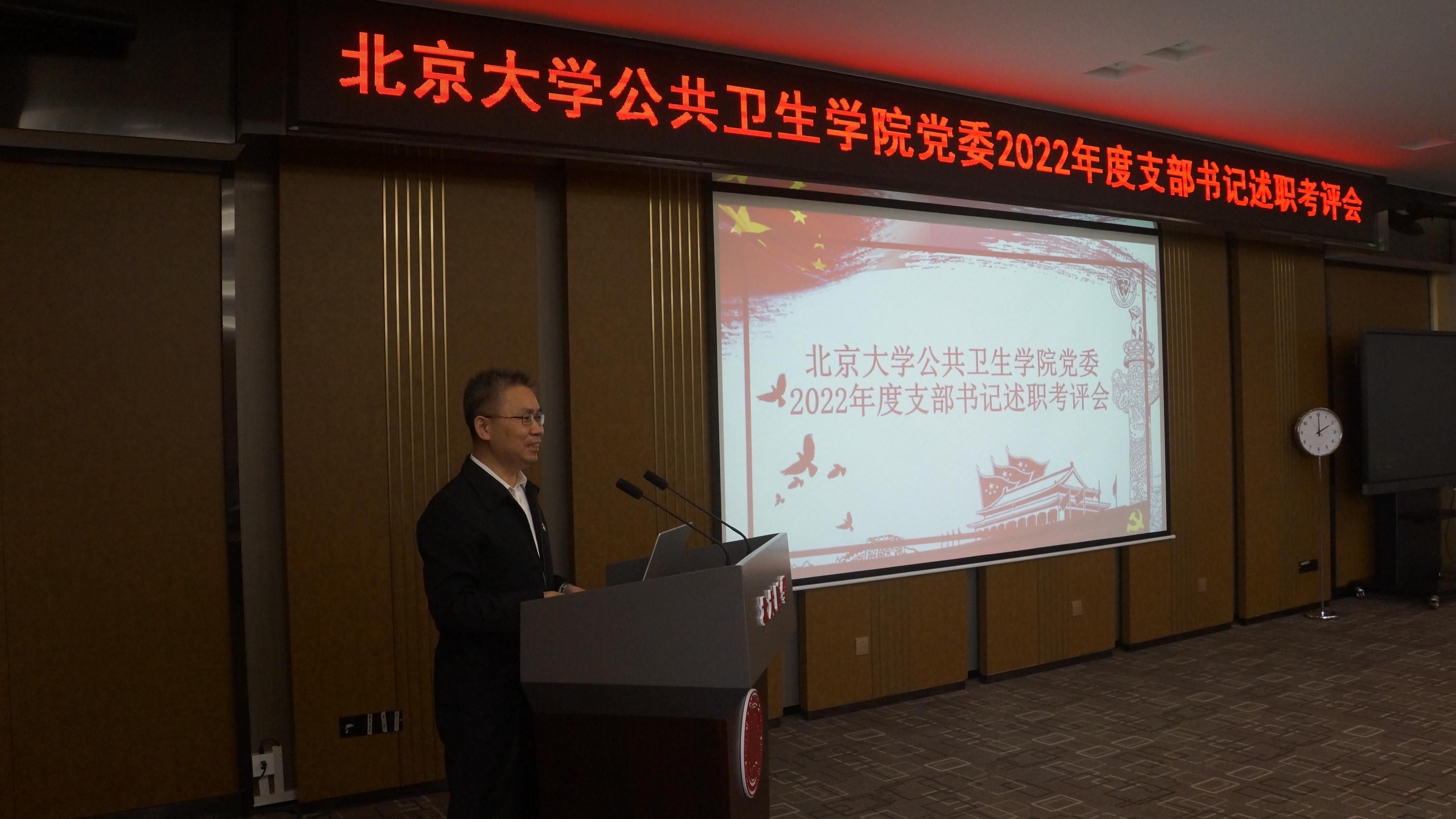 为全面深入学习宣传贯彻党的二十大精神,持续推进基层党支部标准化规范化建设,提升党支部书记履职能力和基层党建工作质量,2023年3月10日下午,北京大学公共卫生学院党委在医学部会议中心205会议室召开2022年度党支部书记述职考评暨2023年党建工作部署会,对过去一年的党建工作进行总结并对新的一年落实好各项党建任务进行规划部署。学院党委委员、教工及学生党支部书记、党委院长办公室及学生办公室工作人员等参加会议。会议由学院党委副书记苏鸿主持。