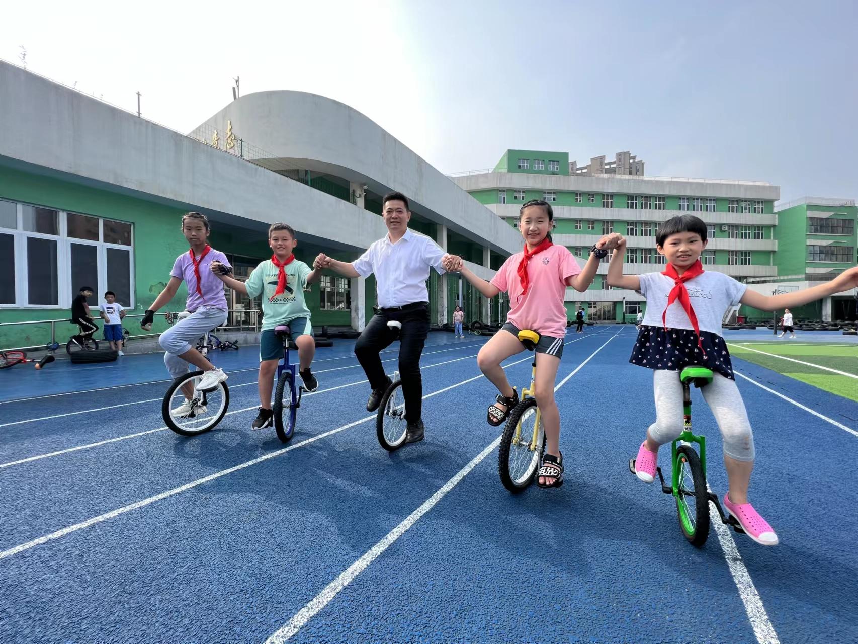 图12 侯明飞校长在学生中推广独轮车项目