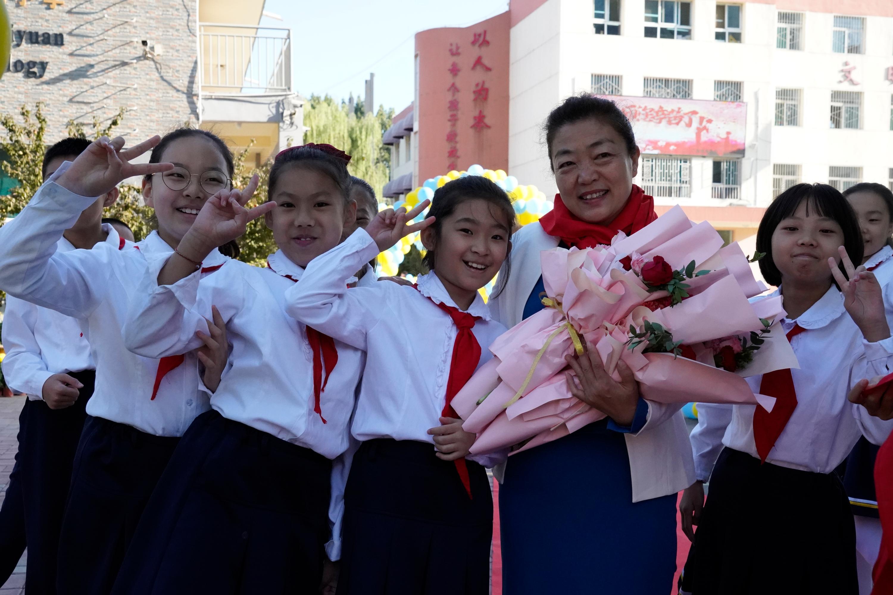 图13 王梅秀校长与孩子们活动合影