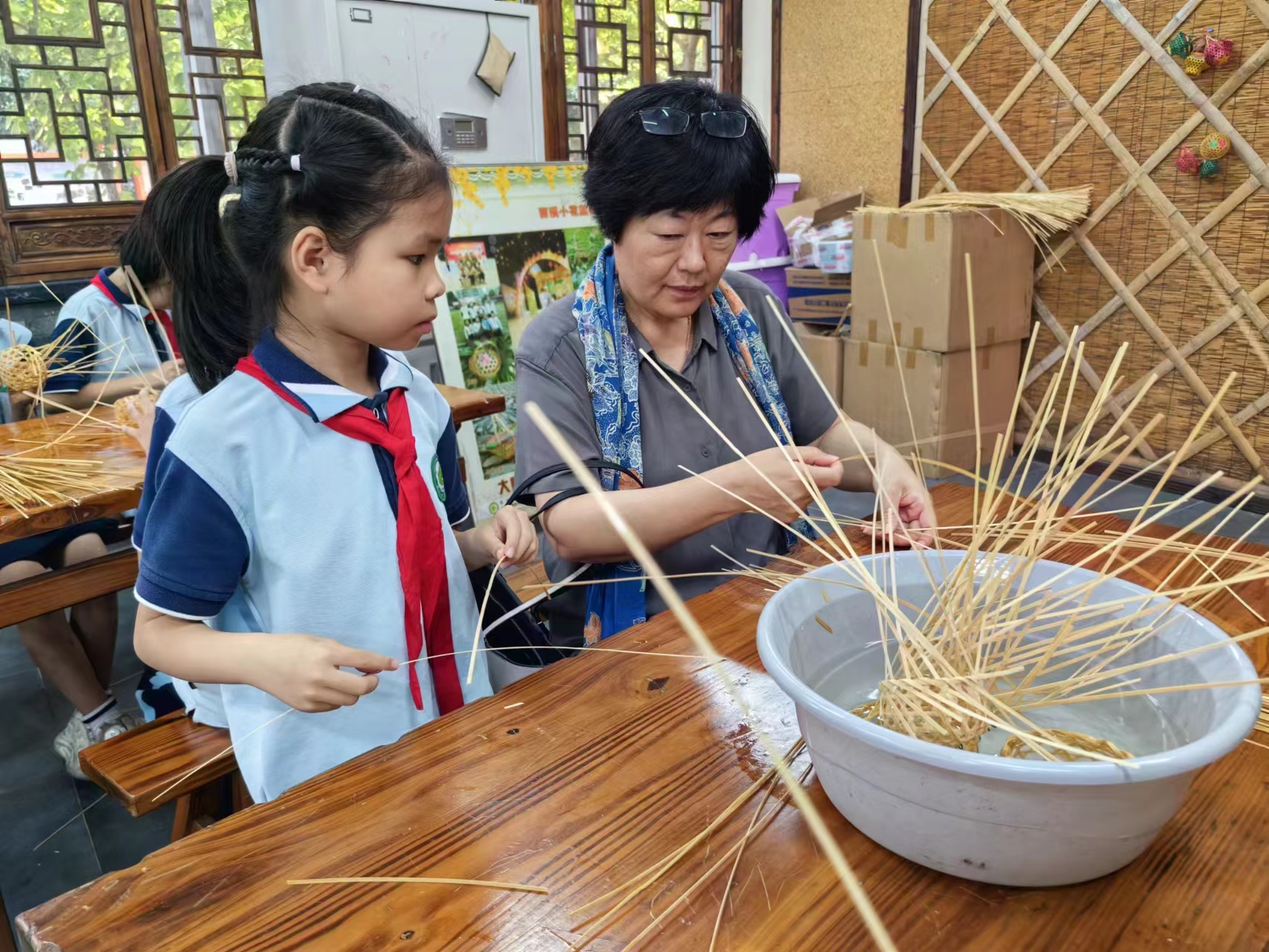 3马迎华教授在杭州市留下小学与同学一起编竹篓
