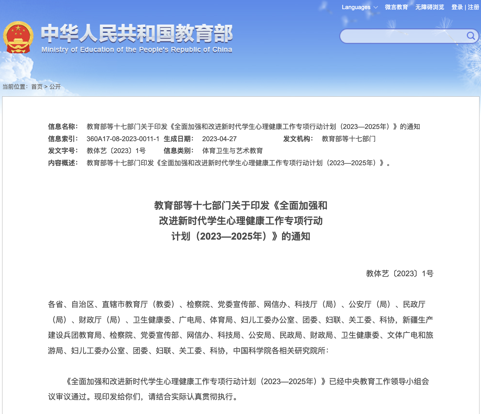 图16-17 教育部等17部门联合印发《全面加强和改进新时代学生心理健康工作专项行动计划(2023—2025年)》