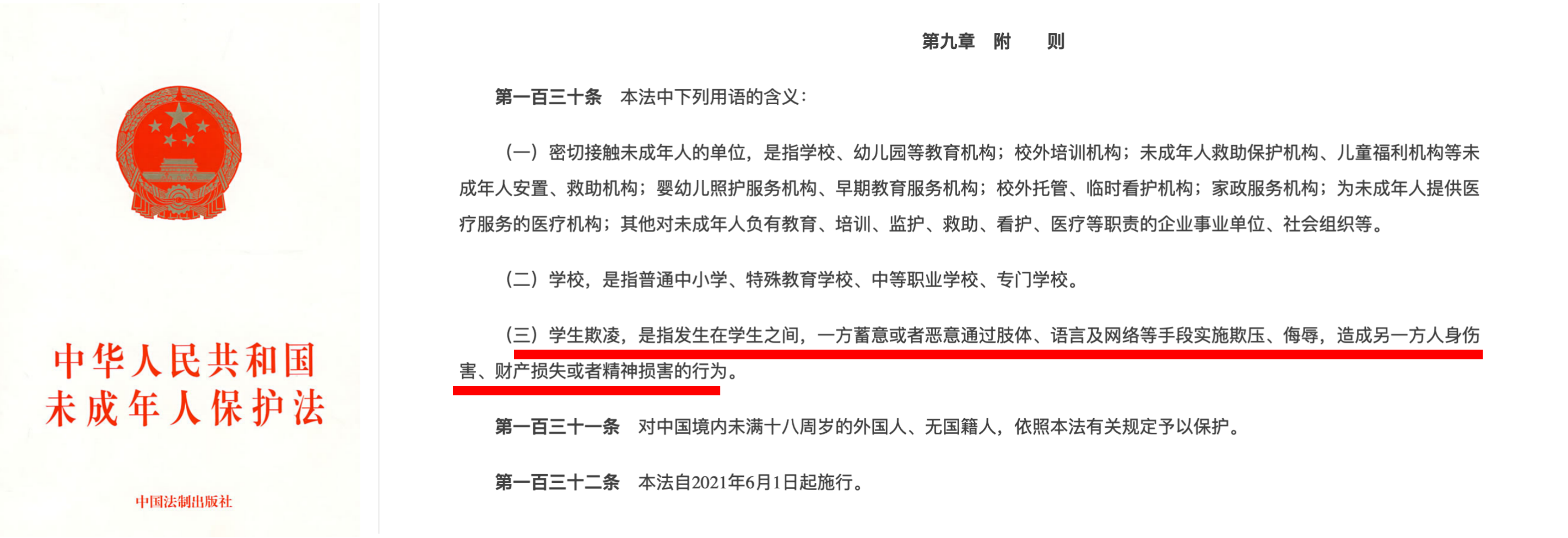 和学者普遍使用“校园欺凌”不同,律师更倾向于使用“学生欺凌”,这个在2020年10月17日颁布的《中华人民共和国未成年人保护法》第130条中首次使用的法律名词。