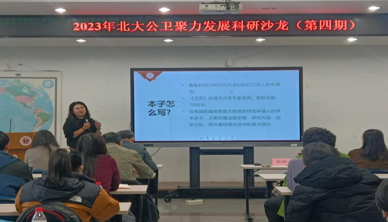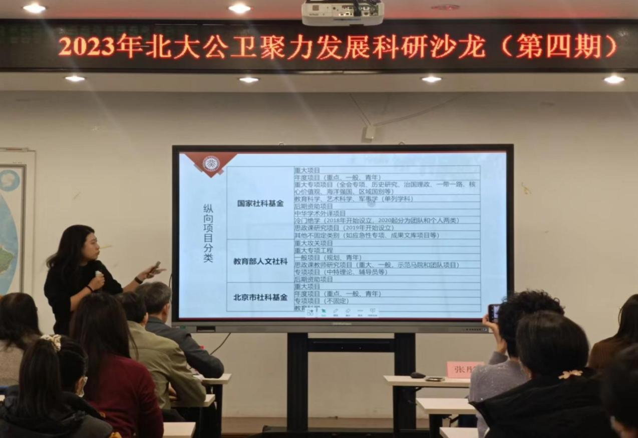 为让学院教师深入了解社科类基金申报相关事宜,提升我院国家社科基金申报质量及中标率,2023年12月13日,由学院科研办、工会联合举办的国家社科基金项目交流沙龙活动在卫三教举行。活动邀请了北京大学社科部张彤老师就国家社会科学基金项目情况分享这一主题进行了讲解,社科部纵向项目办公室张乙茗老师以及各系(所、中心)的50余名骨干教师参加了活动,活动由科研办王洋老师主持,公共卫生学院副院长王海俊教授、党委副书记苏鸿老师、院长助理简伟研教授、科研办主任高苏堤副教授出席了此次活动。