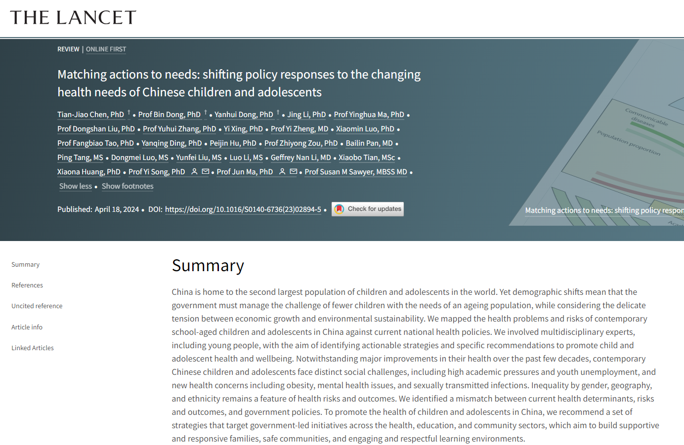 《柳叶刀》(The Lancet)于北京时间4月19日发表来自北京大学公共卫生学院/北京大学儿童青少年卫生研究所宋逸/马军教授团队的重要研究成果。研究团队通过与国内外多领域专家学者合作、以及青年人参与,全面梳理并分析了中国全国性调查数据和高质量研究证据,发现过去三十年,中国儿童青少年整体健康状况得到极大改善,但也面临新的健康问题和社会挑战。当前政策需要全面回应儿童青少年健康问题、健康风险和健康决定因素的快速变化,以匹配其不断发展的需求。为此,研究团队提出了中国儿童青少年健康发展的政策建议和策略,推进审视当前健康投资框架,构建以儿童青少年健康为核心的投资体系,采取更加灵活有效的策略措施,最大限度地促进当下儿童青少年的健康、成长和福祉。柳叶刀杂志邀请作者团队带来文章解读。