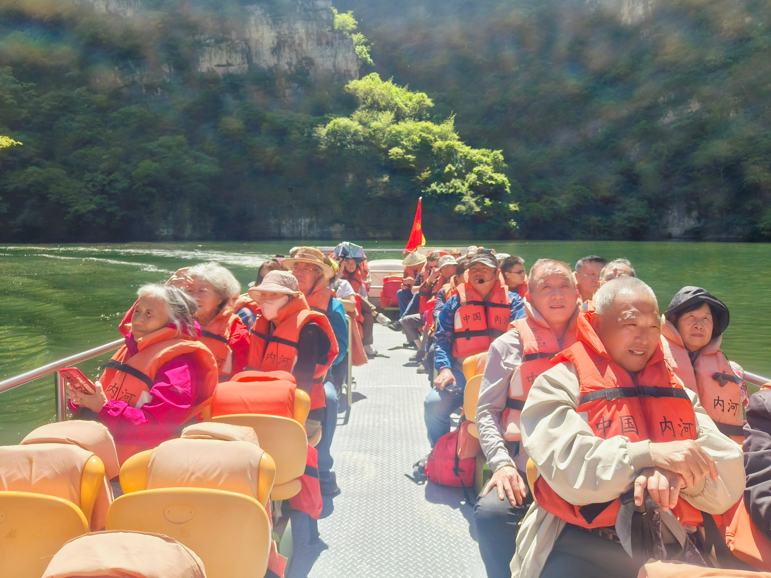 午餐后一行人到龙庆峡景区参观。龙庆峡作为“京郊小漓江”,这里峰峦叠翠、碧水蜿蜒,两岸崖壁上“神笔峰”“镇山如来”等自然奇观若隐若现,仿佛在诉说着岁月的故事。老同志们在工作人员搀扶下登上游船,随着汽笛轻鸣,游船缓缓驶入峡谷深处,在水面遨游,风景像徐徐展开的画卷,两岸的山峰从自己身边慢慢推向身后,河水忽急忽慢,让人流连忘返。