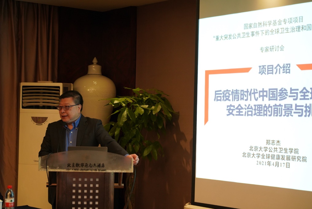 北京大学王宽诚讲席教授、公共卫生学院全球卫生学系主任、全球健康发展研究院副院长郑志杰教授首先对研究项目的意义、目标、内容和成果进行系统介绍,围绕中国参与全球卫生安全治理的路径框架,对其中的要素投入进行了深入阐释,明确当前中国参与全球卫生安全治理的内部挑战。
