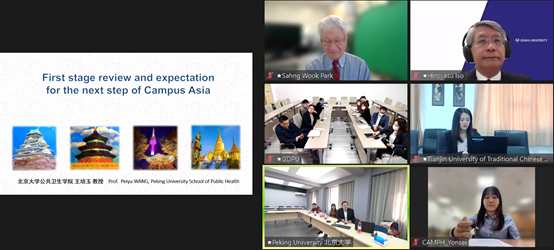 2022年3月2日至3月4日,亚洲校园计划(亚洲高等教育共同体)医学与公共卫生领袖人才培养项目年会在线上会议室召开。中方(北京大学、清华大学、上海交通大学、天津中医药大学、广东药科大学)、日方(大阪大学)、韩方(延世大学)、泰方(玛希隆大学)项目高校合计五十余人出席会议。医学部国际合作处徐白羽教授,学院王培玉教授、任涛副院长、史宇晖副教授、高文静副教授、黄婧副研究员、党院办主任刘杰老师以及相关系所和学科18名研究生参会。