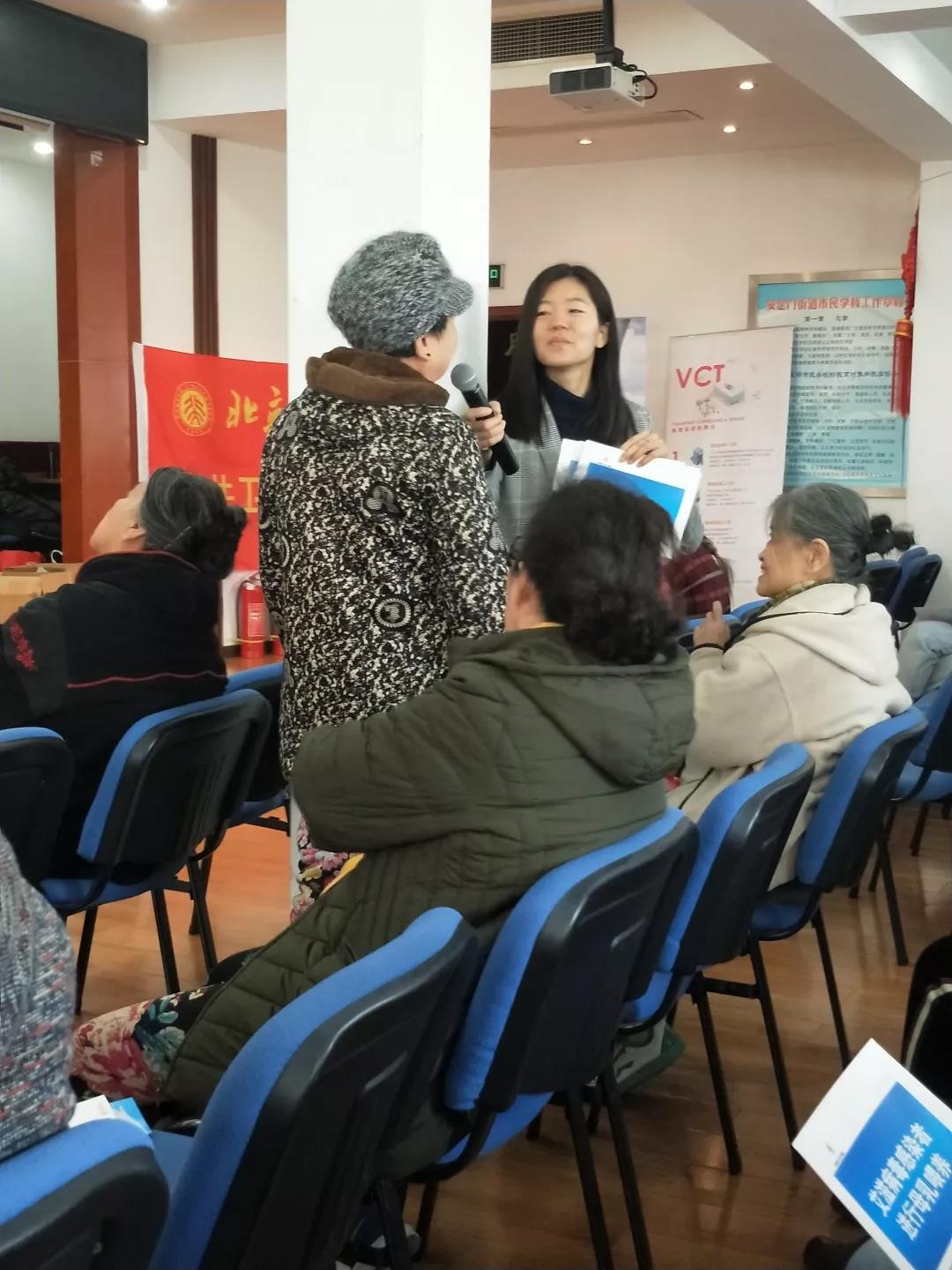 热身环节结束后,志愿者们邀请专家老师为居民带来了防艾小讲座,这次的小讲座注重与居民交流互动,让居民给出自己的见解,共同讨论。老师语言朴素易于接受,加之志愿者不时帮助讲授,更有居民间相互讨论,使大家很快就学习到了艾滋病危害、传播途径、防治措施和国家政策等多方面知识,现场气氛达到了最高峰。
