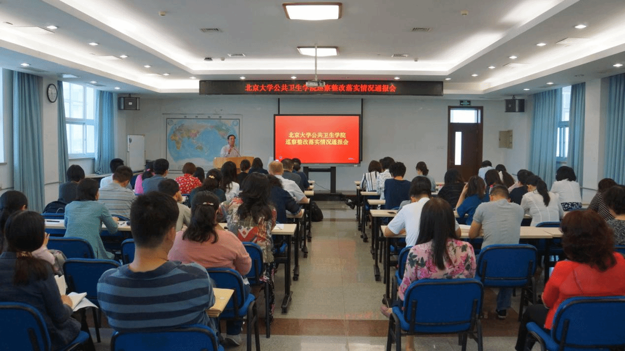 北京大学公共卫生学院巡察整改落实情况通报会于5月27日上午11:00在树华楼卫三教召开。学院党政领导班子成员、各系所主任、副主任、教工及学生支部书记、工会委员、教代(工)会代表、行政人员共60人参会。
