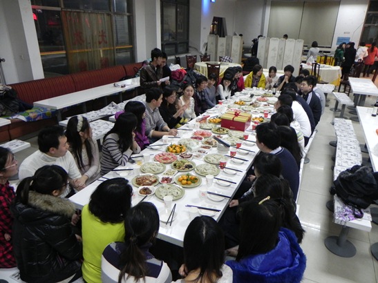 晚上6点半,同学们已经在德园聚齐,迫不及待地来到包饺子的位置,开始大显身手。和面、擀皮儿、包饺子,分工合作,技术娴熟。因为大家来自五湖四海, 所以包的饺子也是形状各异,各有特色。有精致小巧的柳叶饺子,有个大饱满的东北饺子,还有中规中矩、不大不小的“普通”饺子。大家围坐在一起,在包饺子的同时,师兄师姐们和研一新生交谈着学习、实习、找工作或者申请出国的心得经验,大家还不时因谈到一些生活中好玩的事情而开怀一笑。在这种其乐融融的氛围里,拉近了班级里每一名同学的距离。