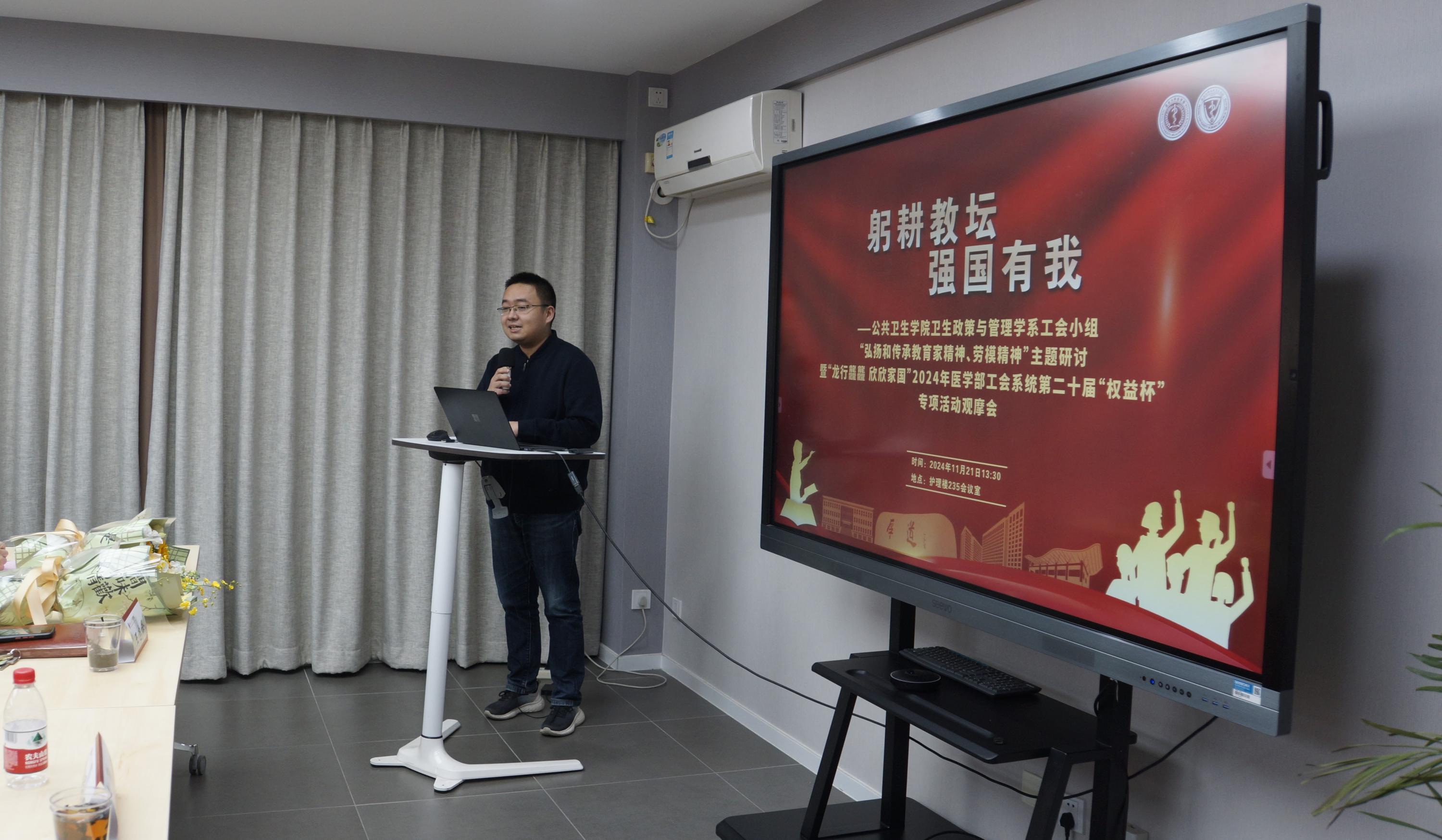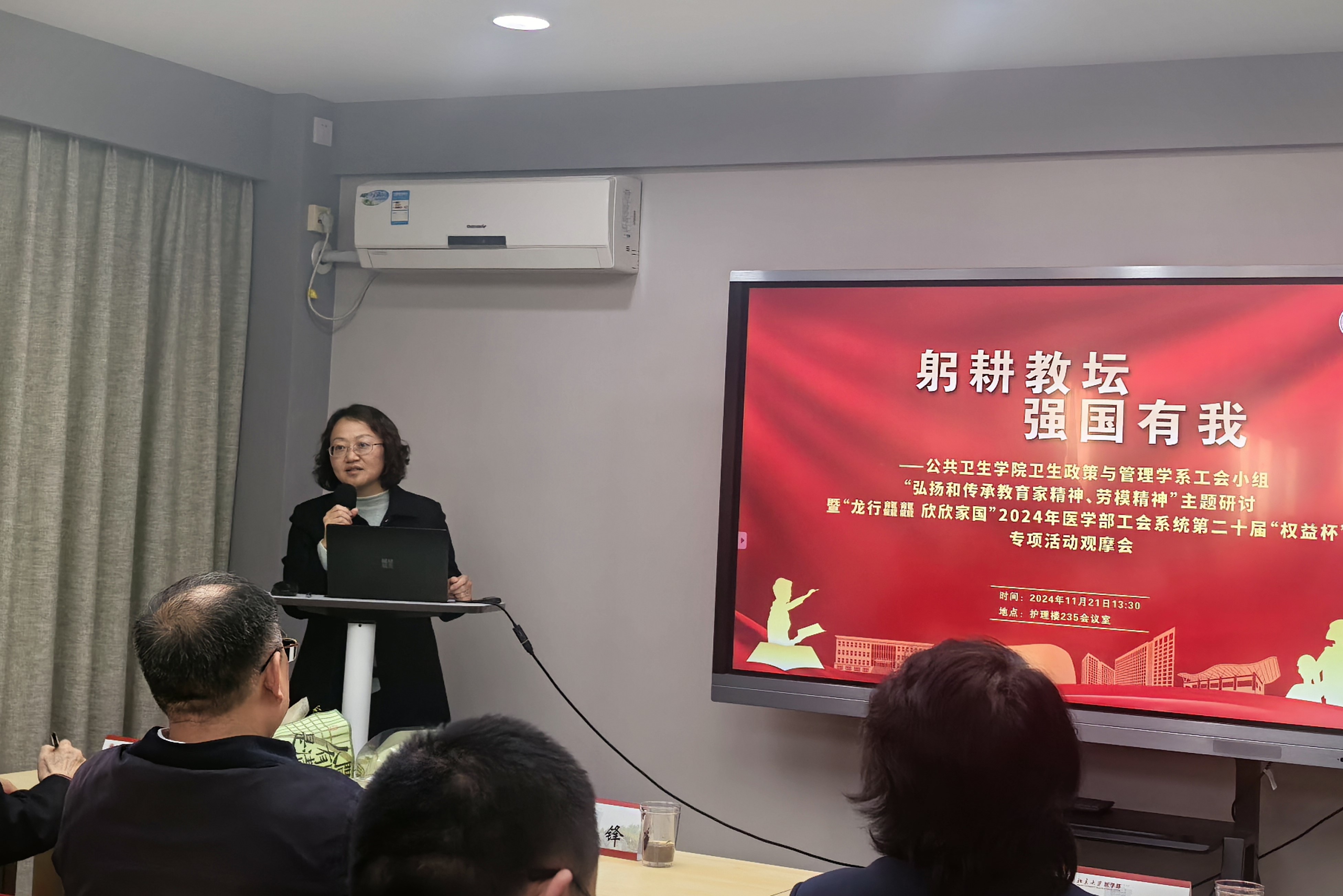 随后,公共卫生学院党委副书记、工会主席苏鸿代表学院致辞,他对卫生政策与管理学系工会小组在“权益杯”立项及申报中的出色表现予以了充分肯定。苏鸿副书记回顾了九十多年来学院教职工队伍不断发展壮大的历程,介绍了学院一贯秉持的“实事求是、艰苦奋斗、无私奉献”学院文化的深刻内涵,用“四个坚持、三个到位”概括总结了学院工会多年一贯坚持、一批批工会干部为之不懈努力所体现出来的优良工作传统:要坚持党委的领导,坚持围绕中心,坚持职工信任,坚持激活基层;工作要准确定位,精准对位,精细到位。苏鸿副书记还对学院工会二十年来参与“权益杯”活动的历史做了梳理,公共卫生学院工会共申报21项活动,其中有18项被评为精品活动,4项被列为观摩活动,成绩斐然。他鼓励学院各工会小组再接再厉,克服困难,改革创新,将今后的活动办得更好。