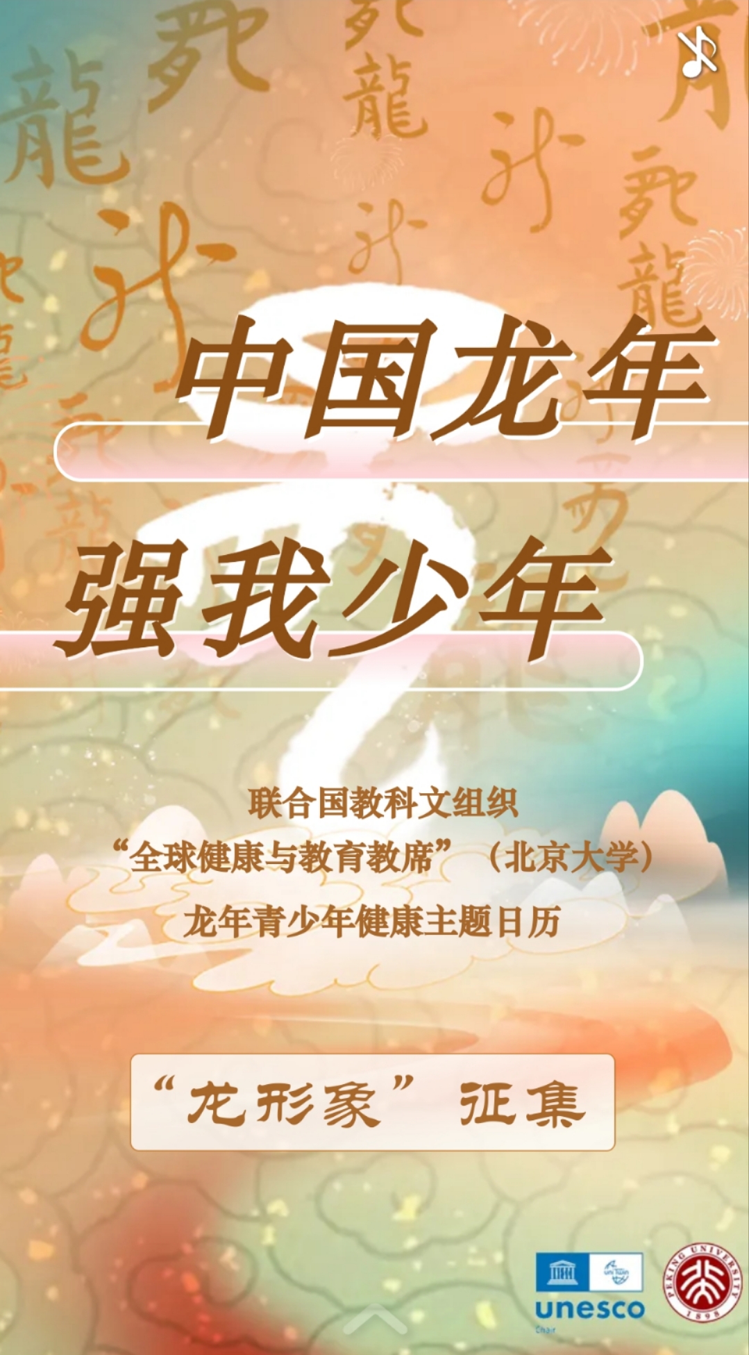一元复始,万象更新。践行“健康第一”,传播健康理念,传递健康风尚,传承中华文化,提升健康素养,服务健康中国。联合国教科文组织全球健康与教育教席(北京大学)在2023兔年青少年健康主题日历取得广泛社会影响和关注的基础上,继续发挥北京大学、中央美术学院、中国传媒大学三校师生跨界跨专业联合策划、创作和设计的优势,全方位、多角度、立体化启动了2024龙年青少年健康主题日系列活动。